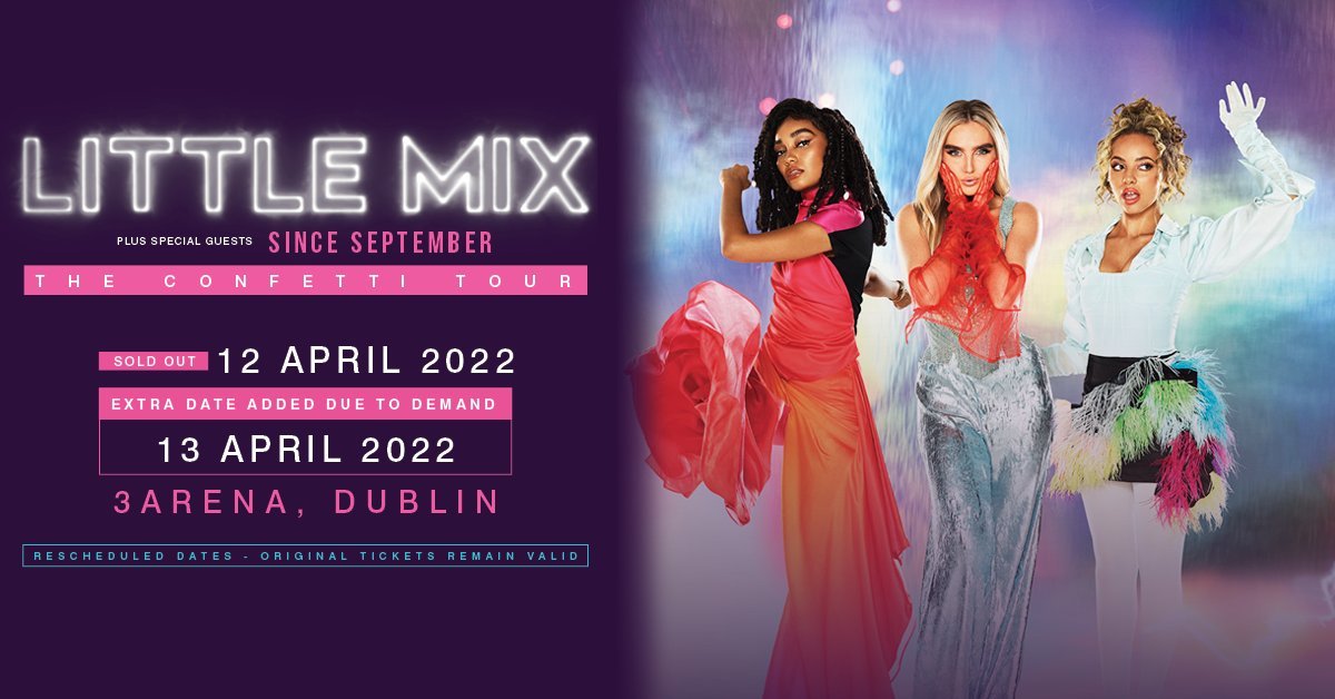 Since then Little Mix have sold more than 50 million records worldwide collected over 3 billion YouTube views and 17 million Spotify listeners. Global pop superstars Little Mix have rescheduled their Confetti Tour and will now bring the show to 3Arena on Tuesday 12th and Wednesday 13th April 2022. The next Little Mix concert in Dublin will take place on Tue April 12 2022 at 3Arena.